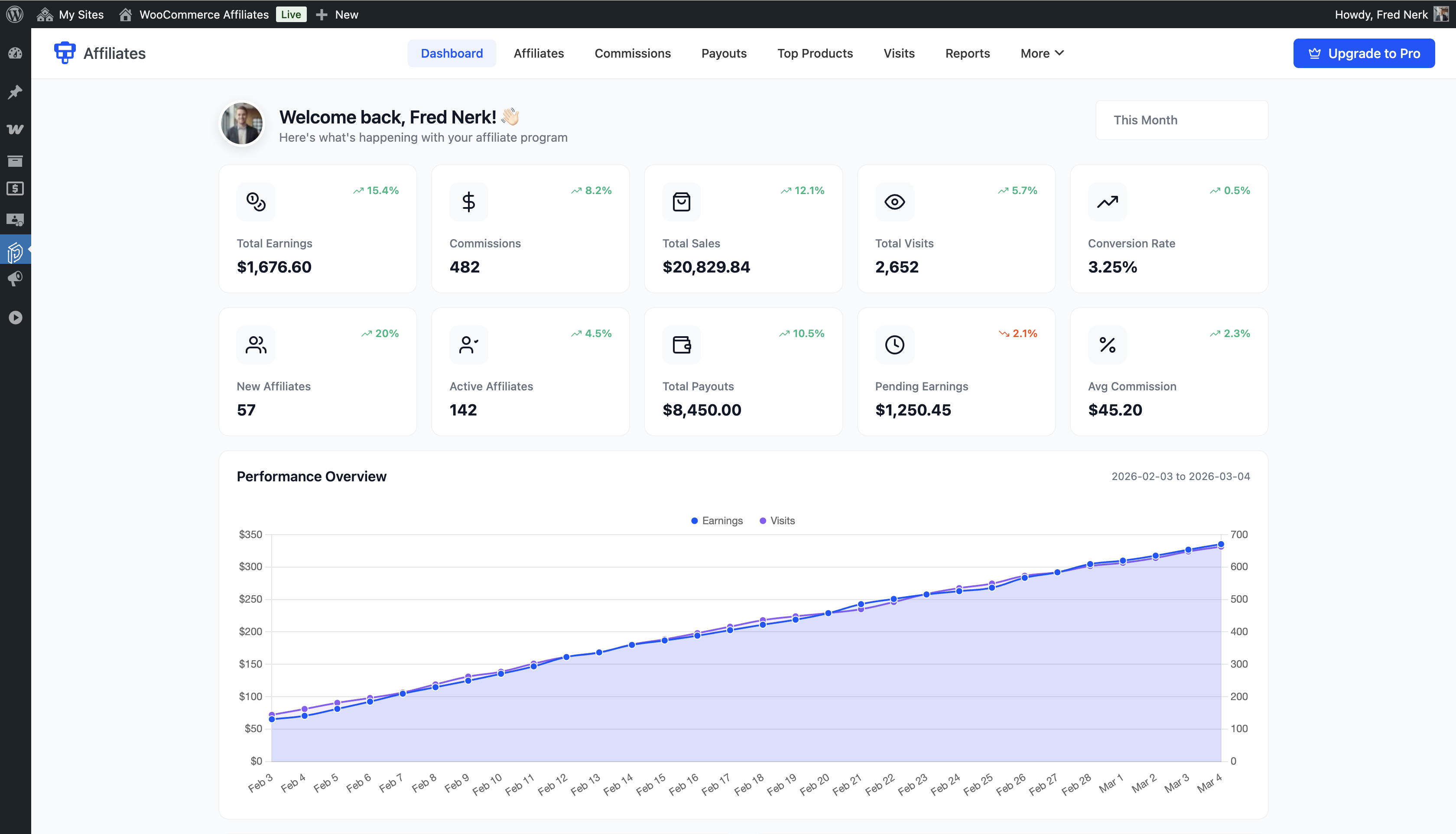 - Interactive charts: Visual earnings, visits, and conversion reports with month-over-month comparisons