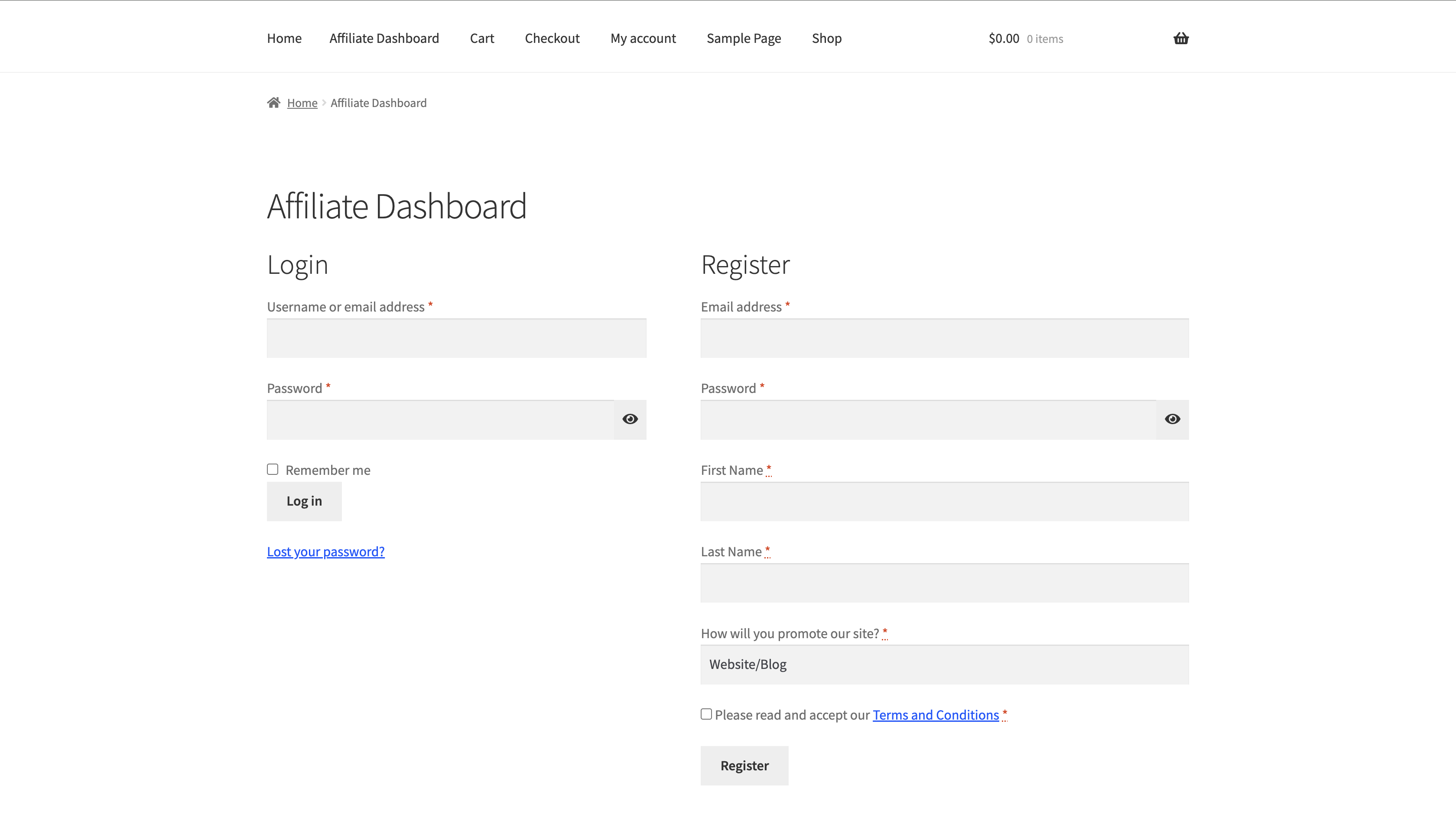 [ddwcaf_affiliate_registration_form_shortcode]shortcode to the page content, publish it, and then set that page as your affiliate dashboard page in the Configuration panel. You can control whether the registration form shows a login form alongside it, or just the signup form on its own. -