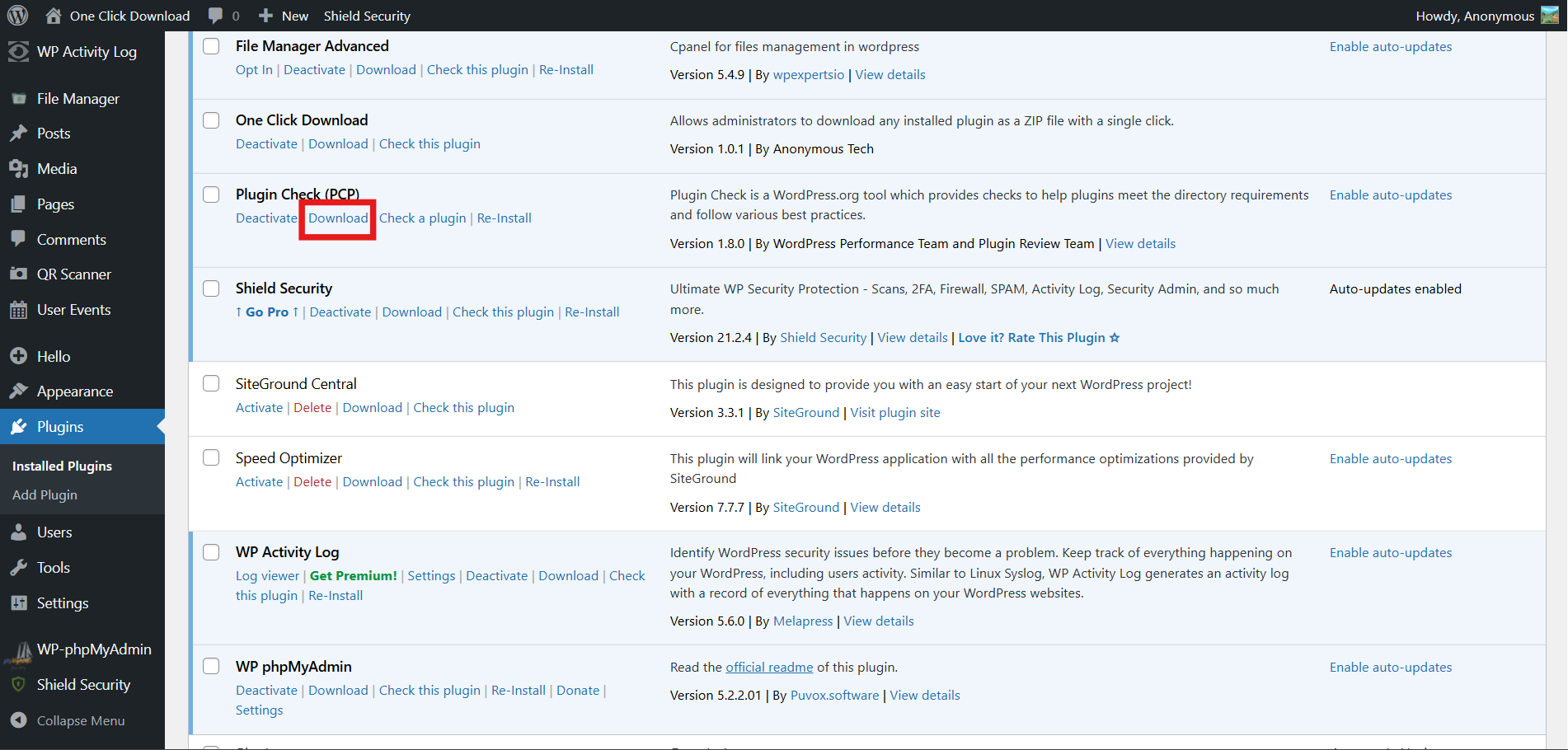 Anonymoustech Instant Download adds a Download button to every plugin inside the WordPress Plugins screen.