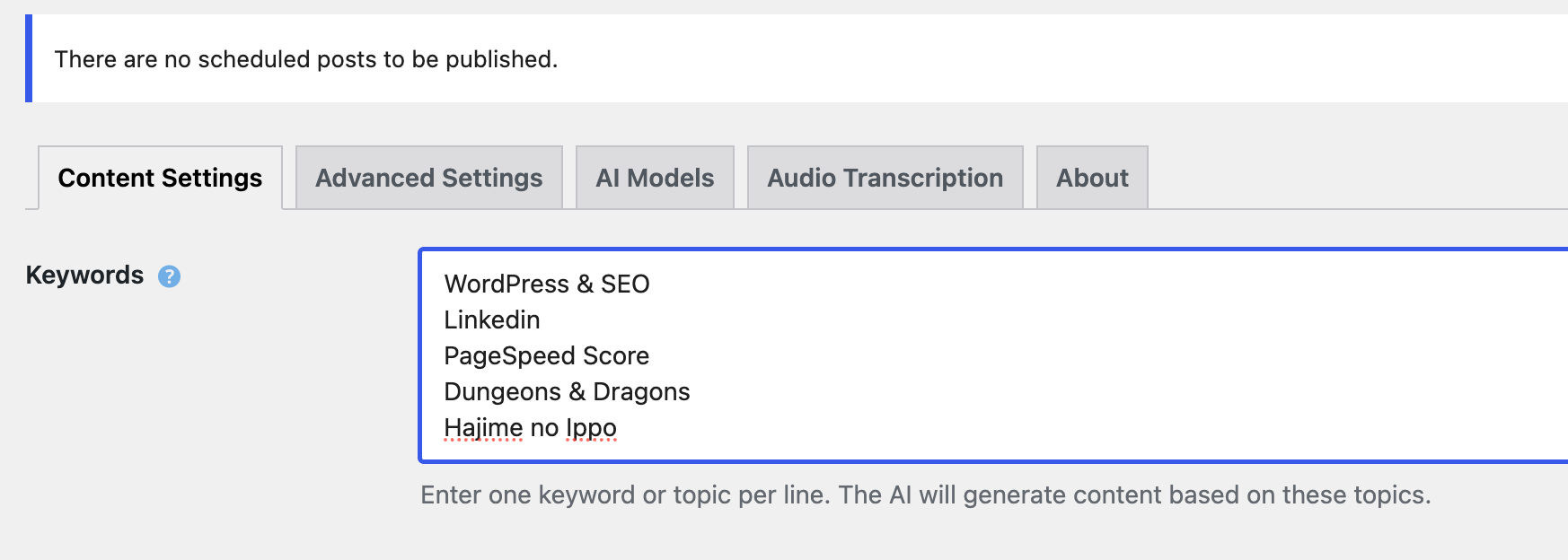 - Contextual Help: Added Dashicon-based tooltips for Keywords, Tone, Models, and API keys to explain settings without cluttering the UI.