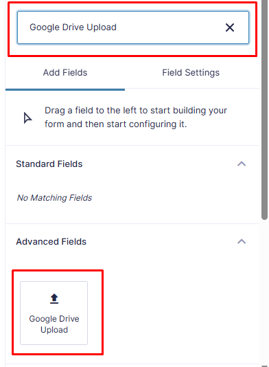• Easy Integration: Drag and drop the “Google Drive Upload” field from the Advanced Fields section in the form editor.