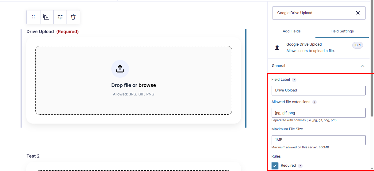 • Field Configuration: Customize file restrictions, including allowed extensions and maximum file size limits directly in the field settings.