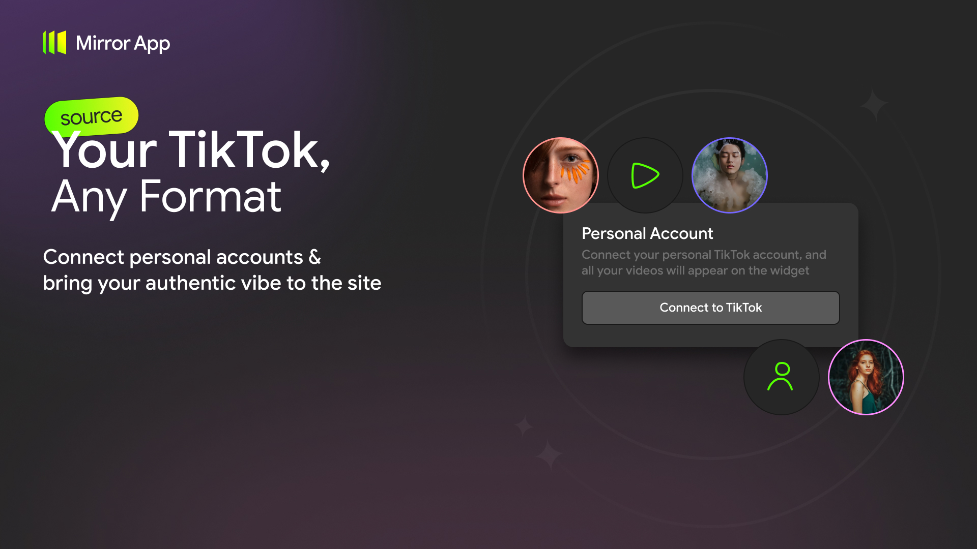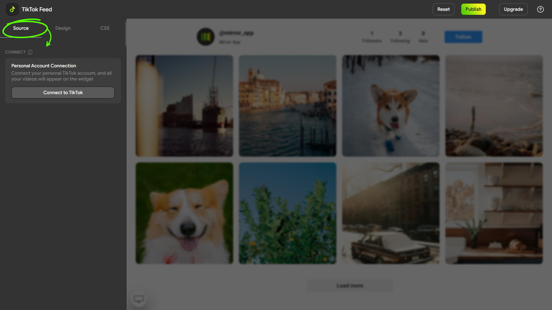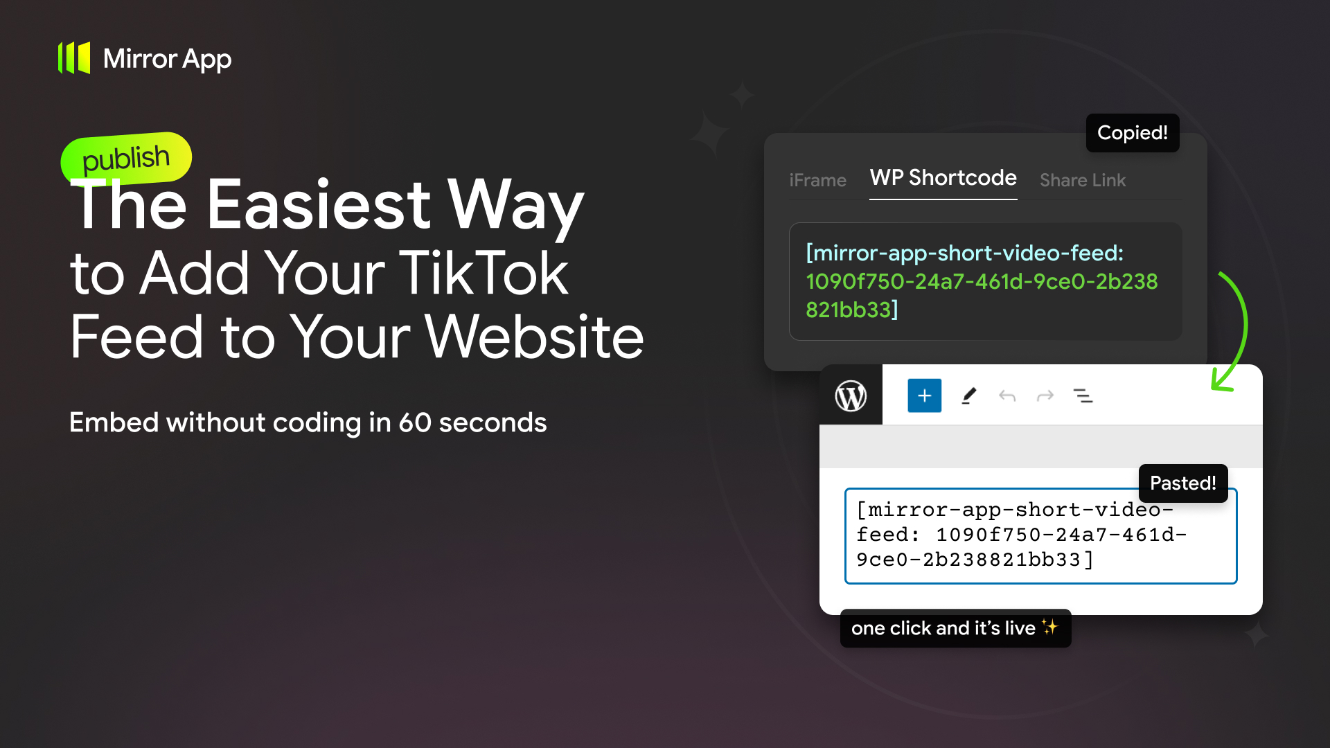 - Go to your Mirror App dashboard, connect your TikTok account, customize your feed, and copy the shortcode.