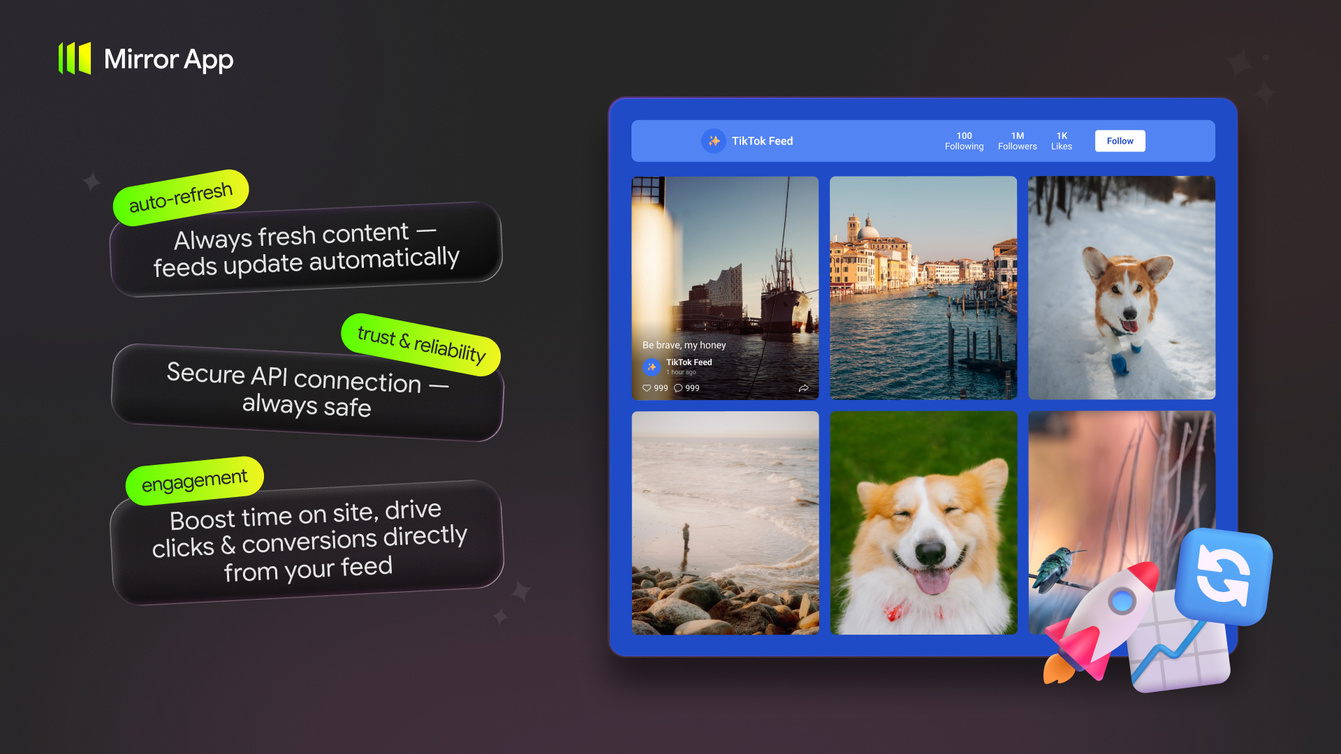The Mirror App – Short Video Feed plugin allows you to display video content from TikTok on your WordPress website in a clean and customizable feed.