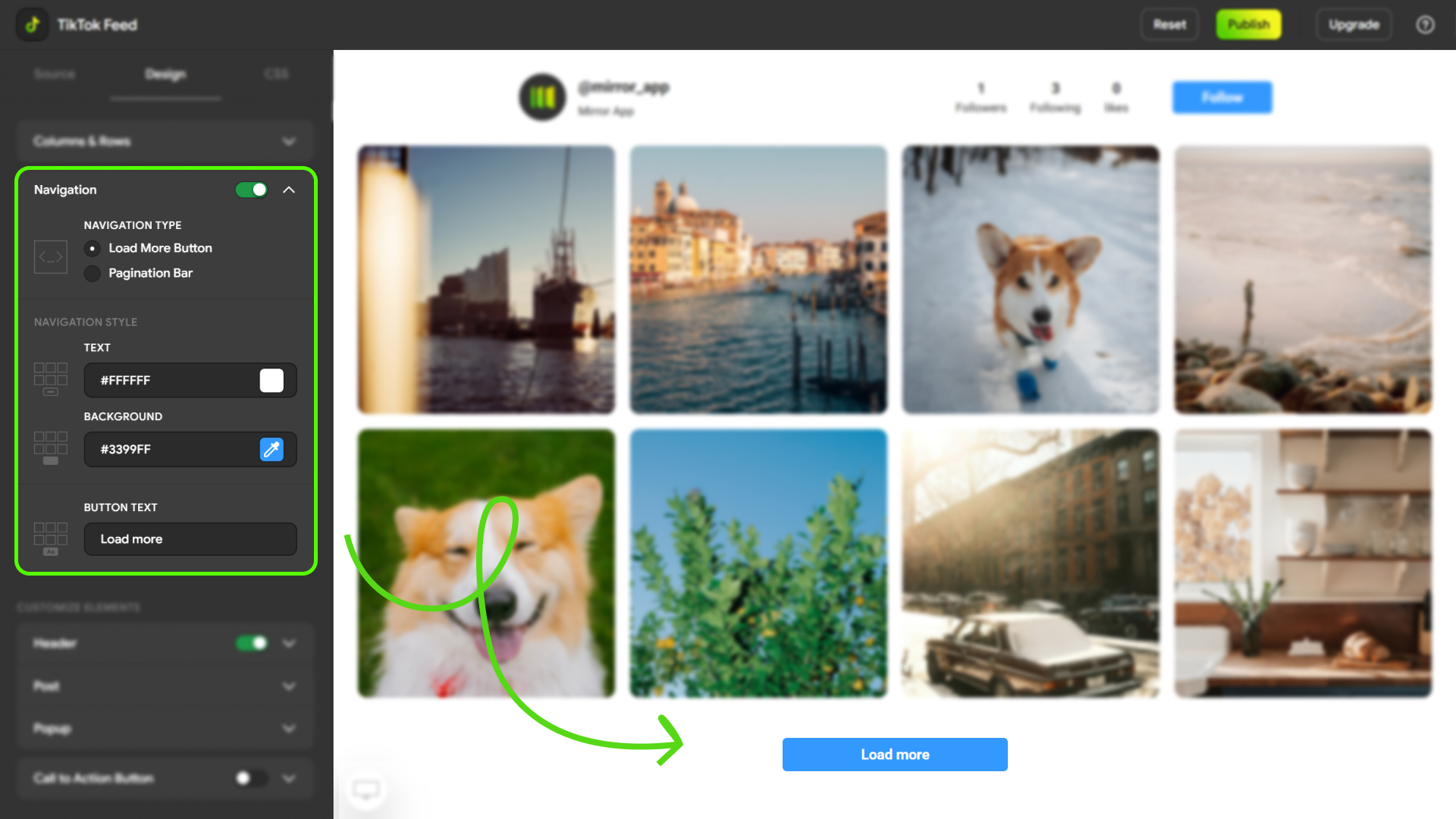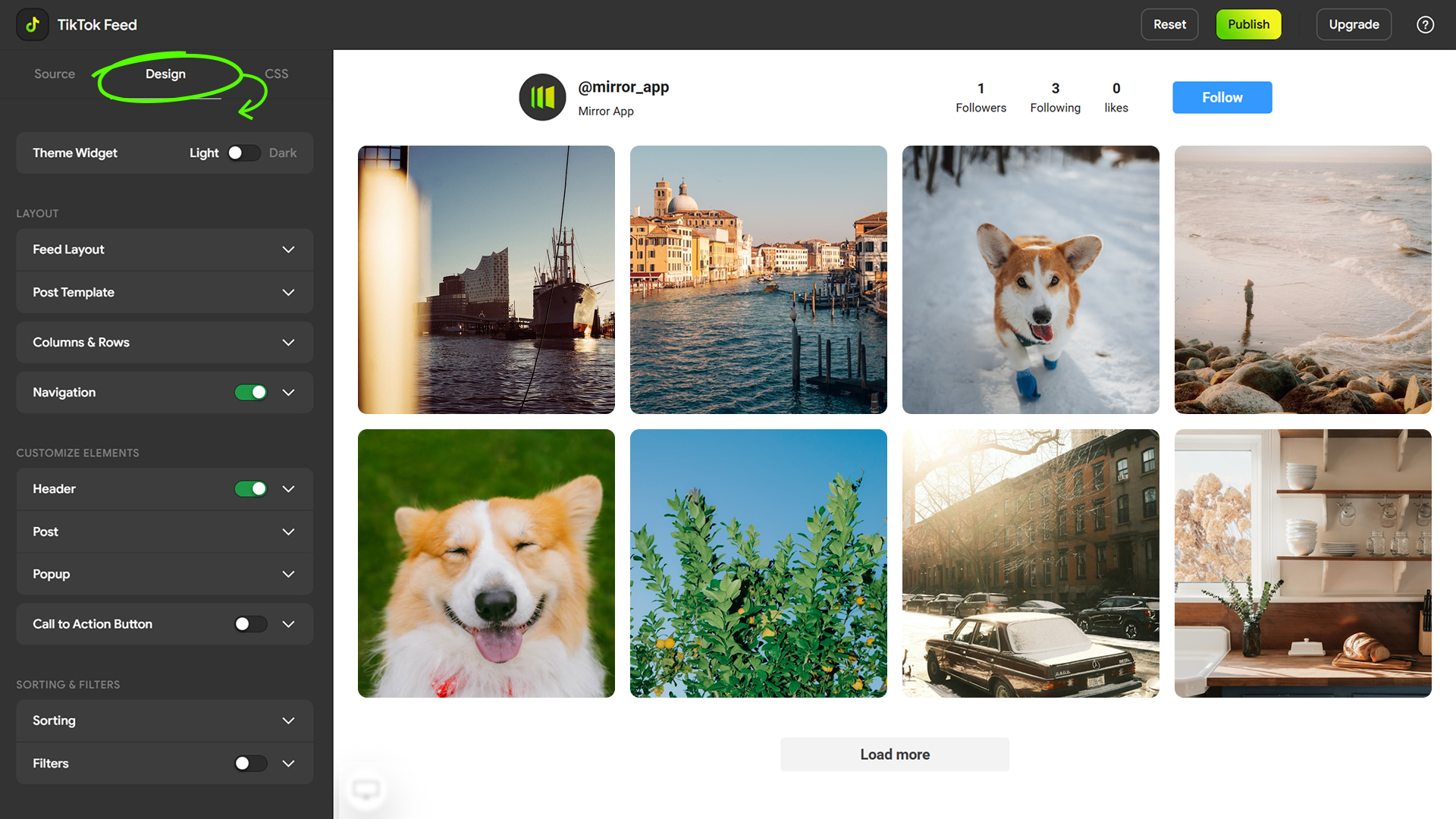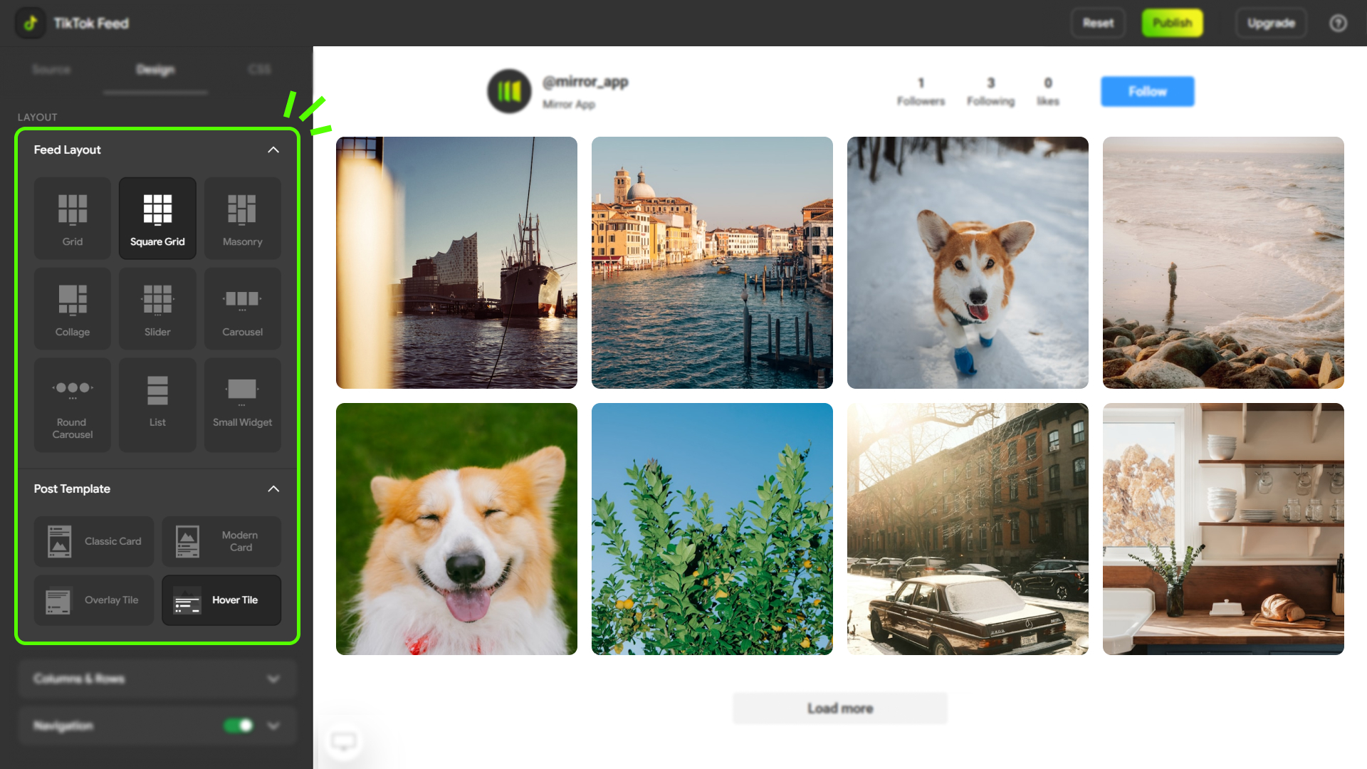 All feed design, layout, and display settings are configured in Mirror App.