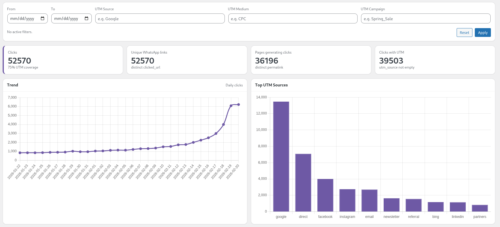 WhatsLink Click Tracker gives you full visibility into your WhatsApp performance directly inside WordPress.