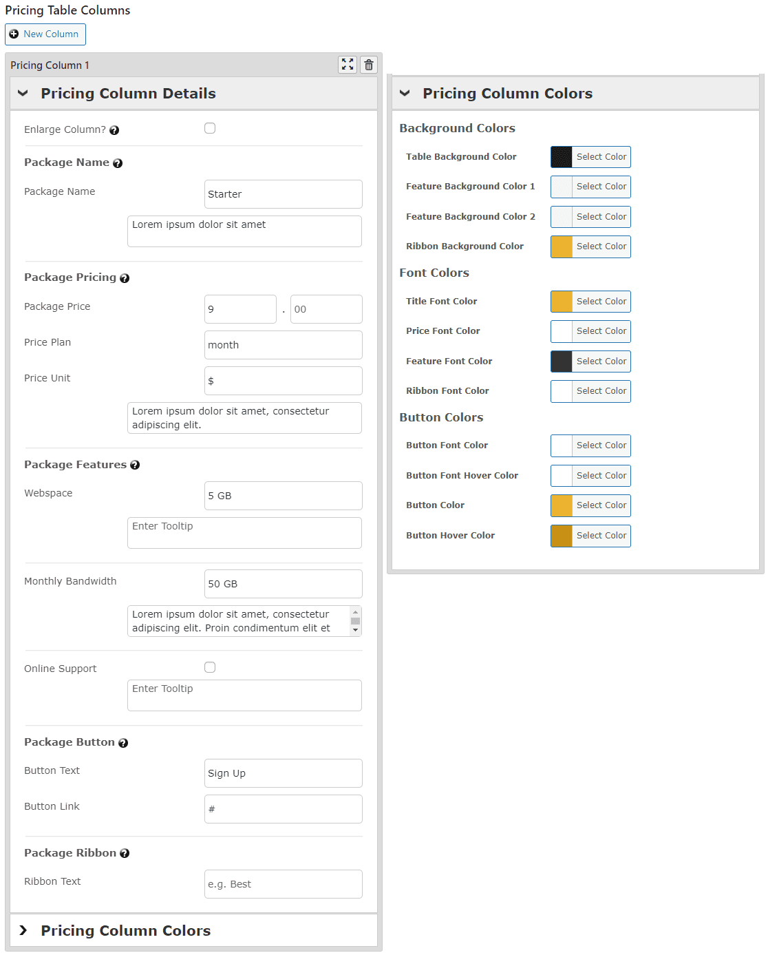 • Pricing Table column details & column colors